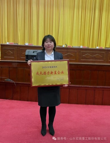 山東宏路重工股份有限公司榮獲了“2024年度淄川區成長潛力新星企業”的榮譽!宏路股份董事會秘書王雪芳代表公司上臺領獎。